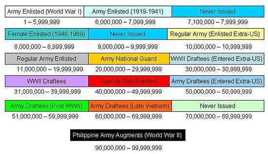 A final service number series of World War II was the ninety million series (90 000 000 - 99 999 999) which was reserved for members of the Philippine Army who had been called up to serve in the ranks of the U.S. Army. These numbers were rarely issued and the ninety million series was permanently discontinued after World War II.