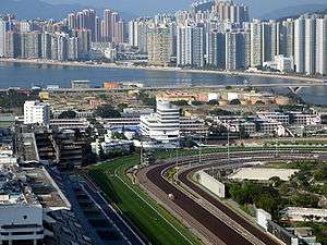 Overview of Sha Tin Sewage Treatment Works. The Sha Tin Racecourse is in the foreground. Sha Tin Hoi and Ma On Shan are in the background.