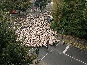 Flock of sheep moving through Cologne, Germany early on a holiday morning