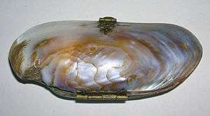A shell purse is a type of coin purse that is made from whole or trimmed mollusk shells, especially from bivalve mollusc shells. These purses are of mainly novelty use and purchased as souvenirs of visits, etc. In the past, some were engraved or painted with floral or other decorations, sentimental messages, personal or place names. In many cases there was extra working of the shell, either grinding down and polishing to expose the mother of pearl or filing to form patterns such as criss-cross designs.