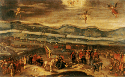 Shein began surrender negotiations in January 1634, and by February they were in full swing.[23] The Russians finally signed a surrender treaty on 25 February 1634,[3][5][23] and on 1 March they vacated their camp.[23] (Some scholars, such as Rickard and Black, give the date of 1 March for Shein's capitulation.)[6][7] Under the surrender terms, the Russians had to leave behind most of their artillery but were allowed to retain their banners after a ceremony in which they were laid before king Władysław. They also had to promise not to engage Commonwealth forces for the next three months.[23] Shein's forces numbered around 12,000 at the time of their capitulation, but over 4,000, including most of the foreign contingent, immediately decided to defect to the Commonwealth.[24]