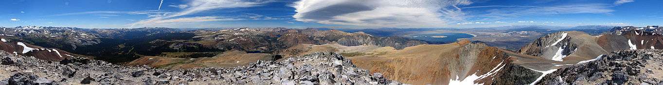 The alpine zone begins near the 9,500 foot (2,900 m) elevation and is easily distinguished as it is above the tree line. No trees grow in this zone due to the harsh climatic conditions. Short, cool summers with long, cold, and snowy winters are typical at these elevations. Many exposed granitic outcroppings, talus slopes, and boulder fields limit the amount of vegetation that grows here. The herbaceous plants need to flower and produce their seeds quickly during the short, frost-free period of summer.[3] The macrolichen flora in the Sierra Nevada alpine zone is not well developed as compared to neighboring alpine zones in the Rocky Mountains and mountains of the Pacific Northwest.[12][13] Some animal species that are adapted to this zone include the American pika, Belding's ground squirrel, the yellow-bellied marmot, and the endangered Sierra Nevada bighorn sheep.[4] This zone can be viewed up close by hiking or climbing into the high elevations of the Sierra.