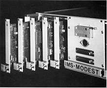 For a short time starting 1979, Philips sold a modular 2650 computer called the 'IMS' – Industrial Microcomputer System,[7] based on the Eurocard format in a 19" rack. It included CPU, PROM, RAM, input, output and teletype modules. This system was meant as a more intelligent programmable logic controller. For development, they later added DEBUG, DISPLAY, INTERRUPT and MODEST ((E)PROM programmer) modules.