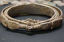 The hoard consists of a variety of silver items including 27 coins, 10 arm-rings, 2 finger-rings, 14 ingots, 6 brooch fragments, a fine wire braid and 141 fragments of arm-rings and ingots which had been chopped up and turned into hacksilver, which was used as a form of currency in Viking times.[5] Together they weigh a little over two pounds (1 kg).[3] The hoard includes Arabic, Anglo-Saxon, Anglo-Viking and Viking coins.[6] They date to around AD 900 and include coins of Alfred the Great and the Danish-ruled Kingdom of Northumbria. Some of the other items appear to have been intended for personal ornamentation, perhaps to indicate the owner's rank.[7] The arm bands would have been given by a leader to a warrior as a reward for services rendered. One of the bands is particularly notable for its unusual combination of Irish, Anglo-Saxon and Carolingian-style decoration.[3]