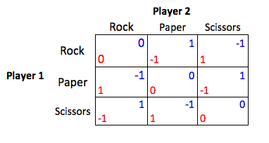 Rock-Paper-Scissors, a widely played hand game, is a real life example of a simultaneous game. Both make a decision at the same time, randomly, without prior knowledge of the opponent's decision. There are two players in this game and each of them has 3 different strategies to make decision; the combination of strategy profiles forms a 3×3 table. We will display Player 1’s strategies as rows and Player 2’s strategies as columns. In the table, the numbers in red represent the payoff to Player 1, the numbers in blue represent the payoff to Player 2. Hence, the pay off for a 2 player game in Rock-Paper-Scissors will look like this:
