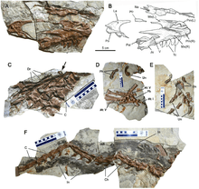 The holotype, JMP-V-05-8-01, was discovered at Hengdaozi, in Sihetun, in Liaoning Province, from the Jianshangou Beds of the Yixian Formation dating from the Barremian-Aptian, about 125 million years old. It consists of a nearly complete skeleton with skull, compressed on a single plate, of an adult individual. Extensive remains of protofeathers have been preserved.[2] In 2012 a second specimen was described, CAGS-IG-T1, of an individual larger than the holotype. The skull was about 10% longer, the feet about a third, a difference explained by positive allometry. The specimen consists of a partial skull, tail, hands, feet and ribcage. It shows filaments on the tail.[3]