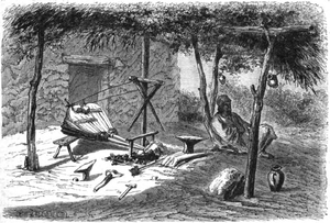 Each of the slave categories was divided into two groups: vătraşi and lăieşi; the former was a sedentary category, while the latter was allowed to preserve its nomadism.[17] The lăieşi category comprised several occupational subgroups: alongside the Kalderash (căldărari or "copper workers"), Lăutari ("string instrument players"), Boyash (lingurari or "spoon makers") and Ursari ("bear handlers"),[18] all of which developed as distinct ethic subgroups, they comprised the fierari ("smiths").[19] For a long period of time, the Roma were the only smiths and ironmongers in Wallachia and Moldavia.[20] Among the fierari, the more valued were the specialized potcovari ("farriers").[10] Women owned by the boyars were often employed as housemaids in service to the boyaresses,[21] and both them and some of the enslaved men could be assigned administrative tasks within the manor.[10] From early on in the history of slavery in Romania, many other slaves were made to work in the salt mines.[10]