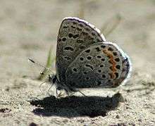 Smith's blue butterfly, Euphilotes enoptes smithi, is an organism in the family Lycaenidae, which is also known as the "gossamer wing" family. This federally listed endangered species occurs in fragmented populations along the Central Coast of California, primarily associated with sand dune habitat in one case with a dune-based Maritime Coast Range Ponderosa Pine forest in the Carbonera Creek watershed in Santa Cruz County.[1] The range of E. enoptes is from Monterey Bay south to Punta Gorda. They live in sand dunes and grassland areas