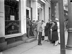 In 1921, an Alcoholic Beverages Act was passed and the Commission des liqueurs du Québec was established to conduct the trade of beer, wine and cider, and eventually spirits too. This state-owned corporation would then on exercise a legal monopoly on all distribution of alcohol in Quebec.[6] In its first year, the commission establishes a quality control laboratory, opens 64 stores selling 383 products, employs 415 people and grosses $15 million in sales.[7]