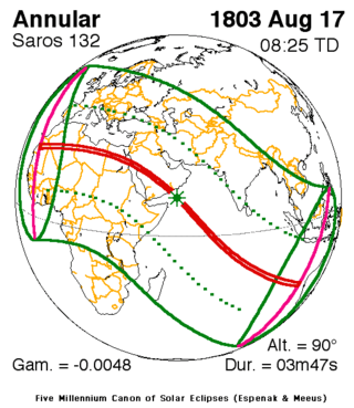 An annular solar eclipse occurred on August 17, 1803. A solar eclipse occurs when the Moon passes between Earth and the Sun, thereby totally or partly obscuring the image of the Sun for a viewer on Earth. An annular solar eclipse occurs when the Moon's apparent diameter is smaller than the Sun's, blocking most of the Sun's light and causing the Sun to look like an annulus (ring). An annular eclipse appears as a partial eclipse over a region of the Earth thousands of kilometres wide. The eclipse was visible in Africa, Asia, Europe, Indonesia and Indian Ocean, while the annularity was visible in northern Africa, Middle East, and Indian Ocean.[1]