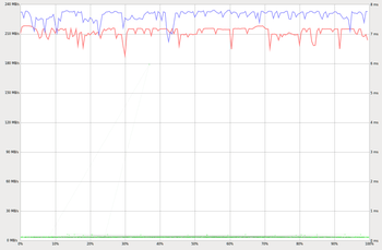 SSD benchmark, showing about 230 MB/s reading speed (blue), 210 MB/s writing speed (red) and about 0.1 ms seek time (green), all independent from the accessed disk location.
