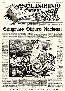Throughout its history, Solidaridad Obrera has had troubles with the authorities. Publication was suspended on 30 November 1907, but resumed the following February. In 1918, following a major recruitment drive by the CNT, the government shut down publication for a brief period.[4] In 1919, publication was moved to Valencia from Barcelona, though it was moved back to Barcelona in 1923, only to be banned the following year by Prime Minister Miguel Primo de Rivera. After de Rivera stepped down, the Second Spanish Republic was founded, and the paper resumed publication on 31 August 1930 with economic help from anarchists of Manresa, Spain, and their own printing press. At this time the paper was being edited by Joan Peiró, and had a press-run of 26,000 copies. In September 1931, the paper took a new direction when it was taken over by members of the FAI,[5] after a confrontation between more moderate treintistas and the anarchists of the FAI, going through seven editors in a matter of fourteen months.