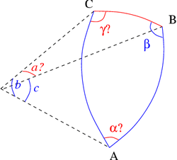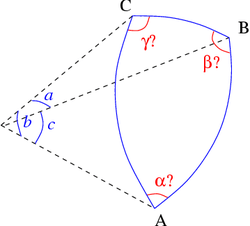Known: the sides a, b, c (in angular units). The triangle's angles are computed from the spherical law of cosines: