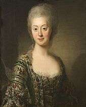 In 1760, the betrothal was again brought up by Denmark, which regarded it as a matter of prestige.[8] The negotiations were made between Denmark and the Swedish Queen, as King Adolf Frederick of Sweden was never considered to be of any more than purely formal importance.[9] Louisa Ulrika favored a match between Gustav and her niece Philippine of Brandenburg-Schwedt instead, and claimed that she regarded the engagement to be void and forced upon her by Carl Gustaf Tessin.[10] She negotiated with Catherine the Great and her brother Frederick the Great to create some political benefit for Denmark in exchange for a broken engagement.[11] However, the Swedish public was very favorable to the match due to expectations Sophia Magdalena would be like the last Danish-born Queen of Sweden, Ulrika Eleonora of Denmark, who was very loved for her kindness and charity.[12] This view was supported by the Caps political party, which expected Sophia Magdalena to be an example of a virtuous and religious representative of the monarchy in contrast to the haughty Louisa Ulrika.[13] Fredrick V of Denmark was also eager to complete the match: "His Danish Majesty could not have the interests of his daughter sacrificed because of the prejudices and whims of the Swedish Queen".[14] In 1764 Crown Prince Gustav, who was at this point eager to free himself from his mother and form his own household, used the public opinion to state to his mother that he wished to honor the engagement, and on 3 April 1766, the engagement was officially celebrated. When a portrait of Sophia Magdalena was displayed in Stockholm, Louisa Ulrika commented: "why Gustav, you seem to be already in love with her! She looks stupid", after which she turned to Prince Charles and added: "She would suit you better!"[14]