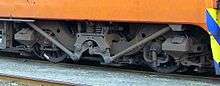 The Class 6E1 locomotives were built with an air brake system, consisting of various valves connected to each other with pipes, commonly referred to as a “bicycle frame” brake system. The compressed air pipes run under the locomotive's belly in a zig-zag pattern, going through bolster and other members to extend its length, to allow the maximum amount of moisture to condense on the way to the reservoirs. As a result, it has multiple pipe connections. A weakness of the system was that, after an accident or even a hard coupling, these pipes tended to develop leaks at the joints, which were extremely difficult to repair.[7]