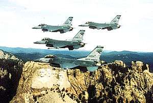Four-ship F-16 formation of the 175th Fighter Squadron "Lobos" from Sioux Falls AGB, South Dakota, over Mount Rushmore. The 175th FS is the oldest unit in the South Dakota Air National Guard, having over 60 years of service to the state and nation | |