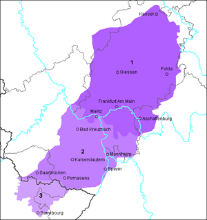 Rheinfränkisch ), or Rhenish Franconian, is a dialect family of West Central German. It comprises the German dialects spoken across the western regions of the states of Saarland, Rhineland-Palatinate, northwest Baden-Wurttemberg, and Hesse in Germany. It is also spoken in northeast France, in the eastern part of the département of Moselle in the Lorraine region, and in the north-west part of Bas-Rhin in Alsace. To the north, it is bounded by the Sankt Goar line (“das/dat line”) which separates it from Moselle Franconian; to the south, it is bounded by the Main line which is also referred to as the Speyer line which separates it from the Upper German dialects.