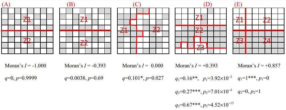 where a population is partitioned into h = 1, ..., L strata; N stands for the size of the population, σ2 stands for variance of the attribute. The value of q is within [0, 1], 0 indicates no spatial stratified heterogeneity, 1 indicates perfect spatial stratified heterogeneity.The value of q indicates the percent of the variance of an attribute explained by the stratification.The q follows a noncentral F probability density function.