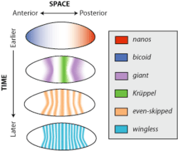 Consider the gene wingless, a member of the wnt family of genes. In the early embryonic development of the model organism Drosophila melanogaster, or fruit fly, wingless is expressed across almost the entire embryo in alternating stripes three cells separated. This pattern is lost by the time the organism develops into a larva, but wingless is still expressed in a variety of tissues such as the wing imaginal discs, patches of tissue that will develop into the adult wings. The spatiotemporal pattern of wingless gene expression is determined by a network of regulatory interactions consisting of the effects of many different genes such as even-skipped and Krüppel.