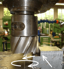 Milling cutter paused after taking a cut. Arrows show the vectors of various velocities collectively known as speeds and feeds. The circular arrow represents the angular velocity of the spindle (rev/min), called the "spindle speed" by machinists. The tangential arrow represents the tangential linear velocity (m/min or sfm) at the outer diameter of the cutter, called the "cutting speed", "surface speed", or simply the "speed" by machinists. The arrow colinear with the slot that has been milled represents the linear velocity at which the cutter is advanced laterally (usually mm/min or inch/min for milling; may also be measured as mm/rev or inch/rev). This velocity is called the "feed" by machinists.