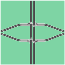 A Split Intersection is a rarely built at-grade variant of the diamond interchange.[1] Compared to a conventional four leg intersection or road crossing, the artierial road is being split-up into separated carriageways by 200 to 300 feet, allowing a queue of left turning vehicles behind a completed turn into the crossroad without any conflict to oncoming traffic. On the crossroad, the four leg intersection is being replaced by two intersections. The beginning one-way traffic at the fourth leg makes the intersecions reduce the number of conflicts similar to a three leg T-intersection to improve traffic flow.[2][3]