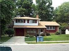 In some regions such as the Northeastern United States, the term "split level" is used to refer to a bi-level house with a split entry. This style of house is also known as a "split foyer." This is a two-story house that has a small entrance foyer with stairs that "split"—part of a flight of stairs go up (usually to the living room, kitchen, and bedrooms) and part of a flight of stairs go down (usually to a family room and garage/storage area). This style is very popular in other areas of the country as well.[2]
