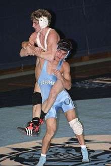 Two college wrestlers in the United States with headgear competing in collegiate (scholastic or folkstyle) wrestling.