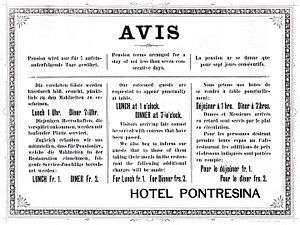 - 1 2 Avis an die Gäste, verwahrt in der Dokumentensammlung Sporthotel Pontresina im Schweizerischen Wirtschaftsarchiv (SWA) in Basel, Signatur H + I E 65.