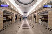 Sportivnaya (Russian: Спорти́вная) is a station on the Frunzensko-Primorskaya Line of the Saint Petersburg Metro. The station was designed by Alexander Konstantinov, Alexander Bystrov and Andrey Larionov. It opened on 15 September 1997 as part of the Pravoberezhnaya Line. Sportivnaya is the only double-decked station with cross-platform transfer on territory of former USSR. The floors are connected by two groups of escalators, one of which is closed as of 2007. The lower floor serves the southbound trains while the upper floor serves the northbound ones. The upper floor is linked to the station's exit to south-eastern side of Petrogradsky island. Since 27 May 2015 the lower floor house an entrance to an transfer corridor equipped with moving walkway which link the station to the exit on the north-eastern side of Vasilyevsky island.[1]