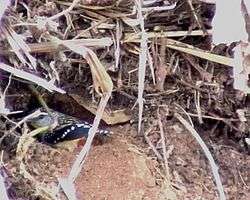 Spotted pardalotes breed between August or September to December or January—generally earlier in the year in northern parts of their range and later in southern areas. The nest is an underground horizontal oval chamber lined with shredded bark, linked by a tunnel 0.5 to 1.5 metres (1 ft 8 in to 4 ft 11 in) long to a hole in the side of a riverbank or slope in a shaded location.[18] The chamber is generally higher than the entrance tunnel, presumably to avoid flooding.[4] Birds have used carpet rolls and garage roll-a-doors to nest in on occasion.[15] Pairs breed once a year, producing a clutch of 3 to 4 round shiny white eggs 16 millimetres (0.63 in) long by 13 millimetres (0.51 in) wide.[18] The eggs are incubated for 19 days until they hatch, with nestlings spending another 21 days in the nest.[15]