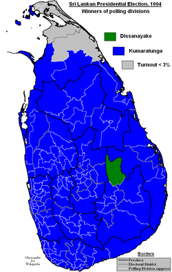 | Winners of polling divisions. Kumaratunga in blue and Dissanayake in green. | ||||||||||||||||||||||||||||||||||||