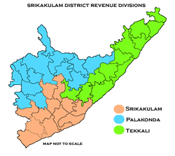 The district has three revenue divisions namely, Srikakulam, Palakonda and Tekkali, each headed by a sub collector. These revenue divisions are divided into 38 mandals in the district.[11] The district has 12 towns and 1,802 villages. There are 1 municipal corporation, 3 municipalities, 1 nagar panchayat and 7 census towns. The municipal corporation in the district is Srikakulam and 3 municipalities in the district are Amadalavalasa, Ichchapuram, Palasa-Kasibugga, and nagar panchayats of Palakonda, Rajam.[12] The 6 census towns are Balaga, Hiramandalam, Narasannapeta, Ponduru, Sompeta, Tekkali.[13]