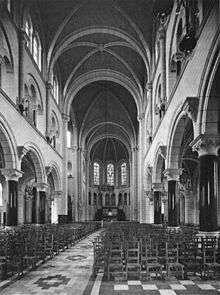 The church is built in a Latin Cross plan with a central nave and two aisles, cut by a small transept. The nave on three levels is divided in four spans by two times three monolithic barrelled columns of polished Labrador granite. The capitals, made of white Euville stone, are all decorated with different motifs. The choir ends in a semi-circular apse under a five-sided arch. The back of the church also forms a semi-circular apse, inspired by the style of the Romanesque churches of the region of the Rhine.