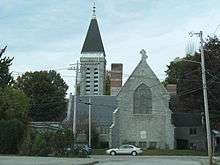 The church occupies a lot between Summer and Pleasant Streets a short way west of downtown Augusta. It is built out of quarry-faced granite, with a gable-roofed main section oriented east-west and two south-facing gabled projections. The western of the two projections has a tall square tower, with buttressed corners, belfry, and pyramidal roof topped by a cross. Windows are either lancet-arched in the Gothic style, or rectangular, and are decorated with tracery. The interior includes marble columns and detailed high-quality woodwork. The chancel ceiling has original stencil decorations.[6]