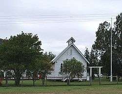 In 1884, two sawmills were opened and in 1886 the Brisbane Valley railway reached Esk, though it was located away from the established settlement. In time the commercial centre of town shifted to be closer to the railway station and yards. Most buildings moved to the northern bank of Sandy Creek or were built there, including the Roman Catholic (1884/1905) and Anglican (1889) churches. The Methodist church built on the south side was moved to Toogoolawah in 1906 and the current church is on the northern side of the creek. Now only the church, school and some houses survive marking the first settlement on the southern bank of Sandy Creek. Later churches were built on the opposite bank, nearer to the later settlement.[1]