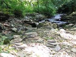 It is believed locally that, in the sixth century, Saint Nectan had a hermitage above the waterfall, and rang a silver bell to warn ships of the dangers of offshore rocks at the mouth of the Rocky Valley during storms.[2] However, one source suggests that in 1799 the site was known as Nathan's Cave, named after a local character, either Nathan Williams or Nathan Cock.[3] There is a late nineteenth or early twentieth century half-timbered private residence known as The Hermitage, supposedly constructed on the remains of a Celtic chapel.[4] Further downstream are the brick remains of St Gerwyn, a house which was destroyed in a fire in the mid-twentieth century.