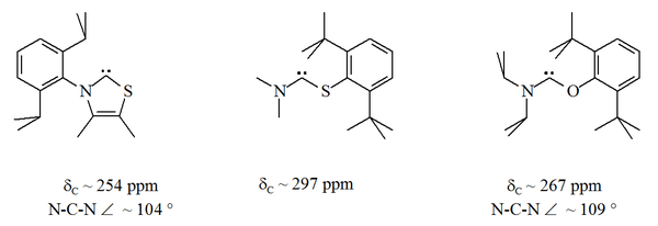 Since oxygen and sulfur are divalent, steric protection of the carbenic centre is limited especially when the N-C-X unit is part of a ring. These acyclic carbenes have diagnostic 13C NMR chemical shift values between 250–300 ppm for the carbenic carbon, further downfield than any other types of stable carbene. X-ray structures have shown N-C-X bond angles of ca. 104 ° and 109 ° respectively.