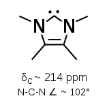 Imidazole-based carbenes are thermodynamically stable and generally have diagnostic 13C NMR chemical shift values between 210–230 ppm for the carbenic carbon. Typically, X-ray structures of these molecules show N-C-N bond angles of 101–102°.