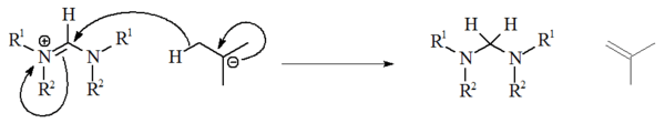 Diaminocarbenes do not truly dimerise, but rather form the dimer by reaction via formamidinium salts, a protonated precursor species.[28] Accordingly, this reaction can be acid catalysed. This reaction occurs because unlike imidazolium based carbenes, there is no loss of aromaticity in protonation of the carbene.