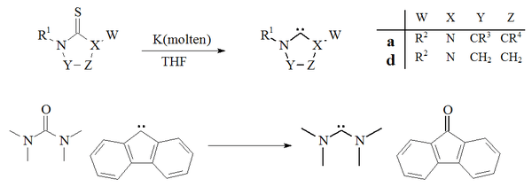 Another approach of preparing carbenes has relied on the desulfurisation of thioureas with potassium in THF.[27][69] A contributing factor to the success of this reaction is that the byproduct, potassium sulfide, is insoluble in the solvent. The elevated temperatures suggest that this method is not suitable for the preparation of unstable dimerising carbenes. A single example of the deoxygenation of a urea with a fluorene derived carbene to give the tetramethyldiaminocarbene and fluorenone has also been reported:[70]
