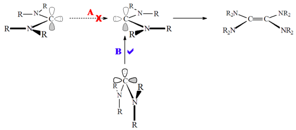 Unlike the dimerisation of triplet state carbenes, these singlet state carbenes do not approach head to head ("least motion"), but rather the carbene lone pair attacks the empty carbon p-orbital ("non-least motion"). Carbene dimerisation can be catalyzed by both acids and metals.
