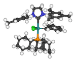 Imidazol-2-ylidenes, triazol-5-ylidenes (and less so, diaminocarbenes) have been shown to co-ordinate to a plethora of elements, from alkali metals, main group elements, transition metals and even lanthanides and actinides. A periodic table of elements gives some idea of the complexes which have been prepared, and in many cases these have been identified by single crystal X-ray crystallography.[39][58][59] Stable carbenes are believed to behave in a similar fashion to organophosphines in their co-ordination properties to metals. These ligands are said to be good σ-donors through the carbenic lone pair, but poor π-acceptors due to internal ligand back-donation from the nitrogen atoms adjacent to the carbene centre, and so are able to co-ordinate to even relatively electron deficient metals. Enders [60] and Hermann[61][62] have shown that these carbenes are suitable replacements for phosphine ligands in several catalytic cycles. Whilst they have found that these ligands do not activate the metal catalyst as much as phosphine ligands they often result in more robust catalysts. Several catalytic systems have been looked into by Hermann and Enders, using catalysts containing imidazole and triazole carbene ligands, with moderate success.[58][60][61][62] Grubbs [63] has reported replacing a phosphine ligand (PCy3) with an imidazol-2-ylidene in the olefin metathesis catalyst RuCl2(PCy3)2CHPh, and noted increased ring closing metathesis as well as exhibiting "a remarkable air and water stability". Molecules containing two and three carbene moieties have been prepared as potential bidentate and tridentate carbene ligands.[36][37]