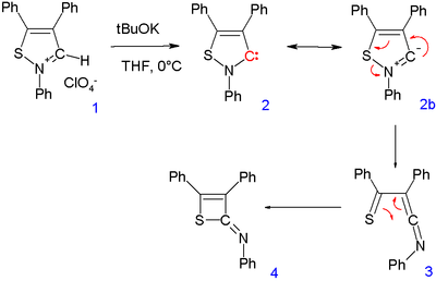 The reported stable isothiazole carbene (2) derived from an isothiazolium perchlorate (1)[55] was questioned,[56] who were only able to isolate 2-imino-2H-thiete (4). The intermediate 3 was proposed through a rearrangement reaction. This carbene is no longer considered stable.[57]