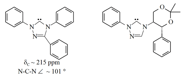 Triazole-based carbenes are thermodynamically stable and have diagnostic 13C NMR chemical shift values between 210–220 ppm for the carbenic carbon. The X-ray structure of the triphenyl substituted carbene above shows an N-C-N bond angle of ca. 101°. The 5-methoxytriazole precursor to this carbene was made by the treatment of a triazolium salt with sodium methoxide, which attacks as a nucleophile.[38] This may indicate that these carbenes are less aromatic than imidazol-2-ylidenes, as the imidazolium precursors do not react with nucleophiles due to the resultant loss of aromaticity.