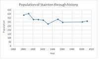 This is a chart showing the population statistics for Stainton between 1881 and 2011 received from census data. In 1941 there was no census so no recorded data. Overtime there has been no considerable fluctuations in the data and the population seems to have kept at a steady rate. In 1881 the recorded population was 388 and the most recent record was 313.[9][10][11] The lack of major fluctuations could suggest that the boundary of the parish hasn't moved over the years and there have been no major inputs and outputs into the village. Peter Wood states that in the past "people rarely moved far away and were often related to each other"[12] which could be the reason for such a stable trend.