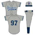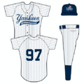 The new primary Staten Island home jersey features the interlocking SI logo with the hat and bat while a new pinstripe alternate was introduced that uses an alternate script Y logo that is also features on the team's primary home and road cap. The road jersey remained the same except with the new SINY logo patch that was added to all the game jerseys on the left sleeve. The Yankees introduced two alternate caps, one that features the interlocking SI logo with the hat and bat and the other featuring the SINY logo. The batting practice jersey now features the script Y logo on the left chest with a flex-fit mesh hat that features a stylized top hat logo.