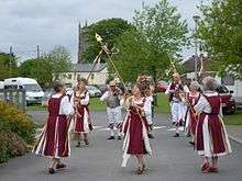 Stave dances are, essentially, English country dances adapted to have dancers perform whilst carrying a stave over their right shoulder. They are performed by mixed groups of dancers, organised into sets of four, six, eight, or more who perform figures to the accompaniment of traditional country dance tunes.[2] The steps are similar to those used in some Morris and country dances including double-stepping, a travelling ‘ranting’ or ‘polka’ step, and a country dance ‘chasing’ step - also known as a 'Dorset skip-change' step. Whilst the staves are mainly carried on the shoulder, some dances require the dancers to form arches or other figures. Few original dances are known—most of those now performed originate from a small group of villages in Somerset and Dorset—notably Stourton Caundle and Fifehead Magdalen although many new dances have been choreographed within the style.