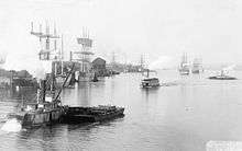 In 1871, the Tualatin River Navigation & Manufacturing Company began work to complete a continuous navigable waterway from the Tualatin to the Willamette. The company planned to build two canals: one to connect the Tualatin River to Sucker Lake with access to the iron smelter located on its east end; and a second with locks that would connect Sucker Lake to the Willamette via Sucker Creek.[7] The first canal was finished in 1872, but due to low water, was not passed through until January 21, 1873, when Onward made the first trip.[5][7]
