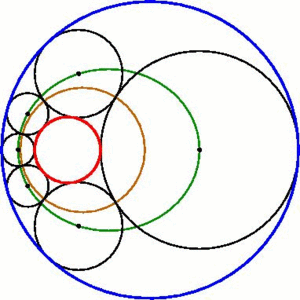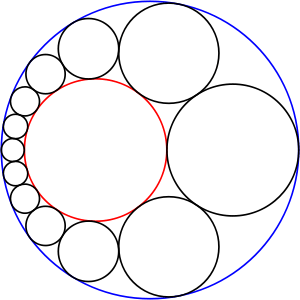 In geometry, a Steiner chain is a set of n circles, all of which are tangent to two given non-intersecting circles (blue and red in Figure 1), where n is finite and each circle in the chain is tangent to the previous and next circles in the chain. In the usual closed Steiner chains, the first and last (nth) circles are also tangent to each other; by contrast, in open Steiner chains, they need not be. The given circles α and β do not intersect, but otherwise are unconstrained; the smaller circle may lie completely inside or outside of the larger circle. In these cases, the centers of Steiner-chain circles lie on an ellipse or a hyperbola, respectively.