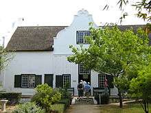 This house is the first period house in the museum complex and is furnished according to the period c. 1709. The house was built in August 1707 by Sebastian Schreuder, who was a German messenger of the court of the Dutch East India Company.[1] This modest pioneer cottage has a thatched roof and clay floor. The house has some unusual windows as glass was a rare commodity and had to be imported from Holland. The colonists therefore developed a system of stretching linen or gauze tightly over a frame and using beeswax or similar substances to seal the cloth against the elements. During a hard downpour, the housewife simply closed the outside shutters; in fine weather the catches were released, the whole frame was lifted out, and fresh air was let in.[2] The house was declared a monument in 1974 and is currently listed as a Grade II Western Cape provincial heritage site.[3]